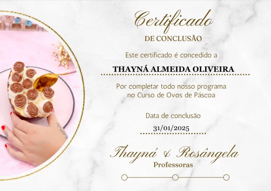 Finalize o curso com a confiança de quem está preparado! Ao concluir todas as aulas, você receberá um certificado exclusivo, comprovando sua dedicação e aprendizado no mundo dos ovos de Páscoa. Um reconhecimento especial para marcar essa conquista deliciosa!